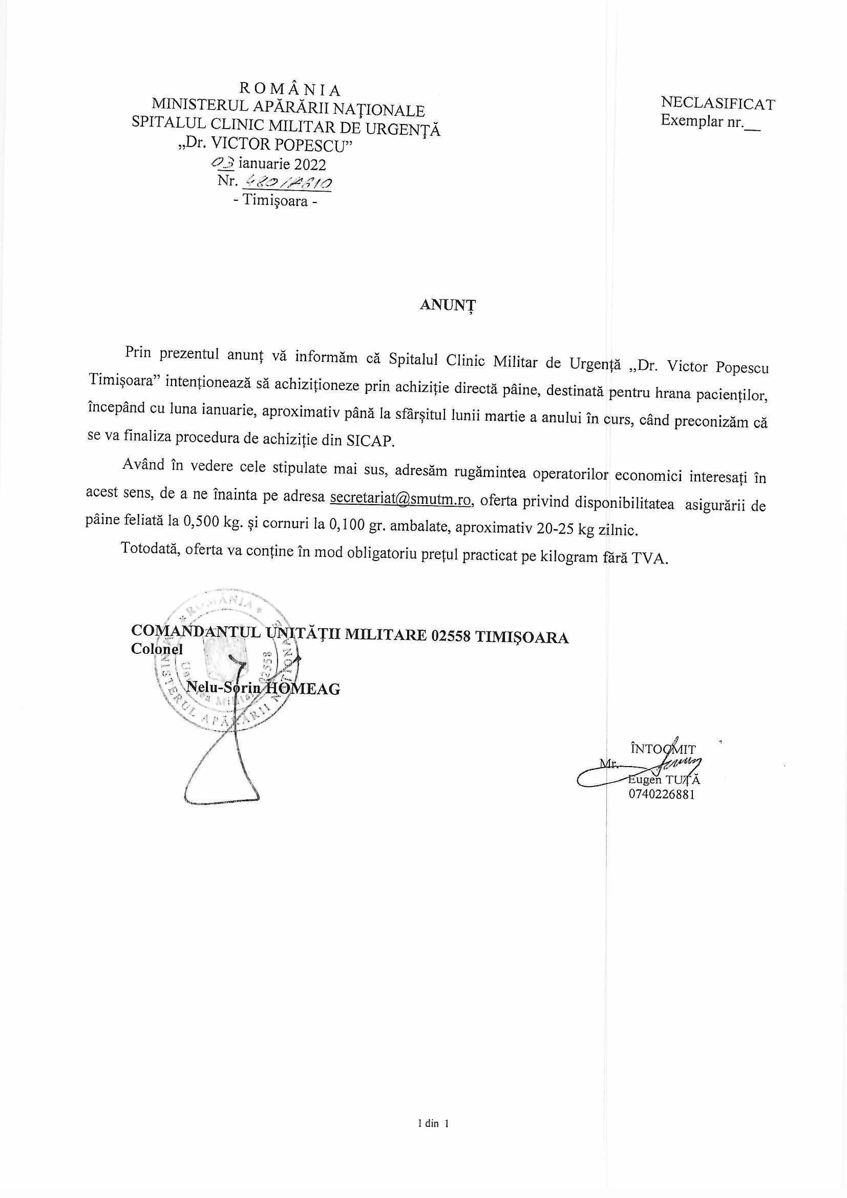 Ministerul Apărării Naţionale, prin U.M. 02558 Timişoara, organizează licitaţie publică cu strigare în vederea închirierii spaţiului în suprafaţă de 16,17m², situat în pavilionul A (încăperea 75), cazarma 706 Timişoara/Spitalul Clinic Militar de Urgenţă ,,Dr. Victor Popescu”, str. Gheorghe Lazăr, nr. 7, pentru desfăşurarea de activităţi specifice unui chioșc pentru distribuirea produselor cum ar fi cafea, ceai, băuturi răcoritoare, dulciuri, produse de patiserie, etc.